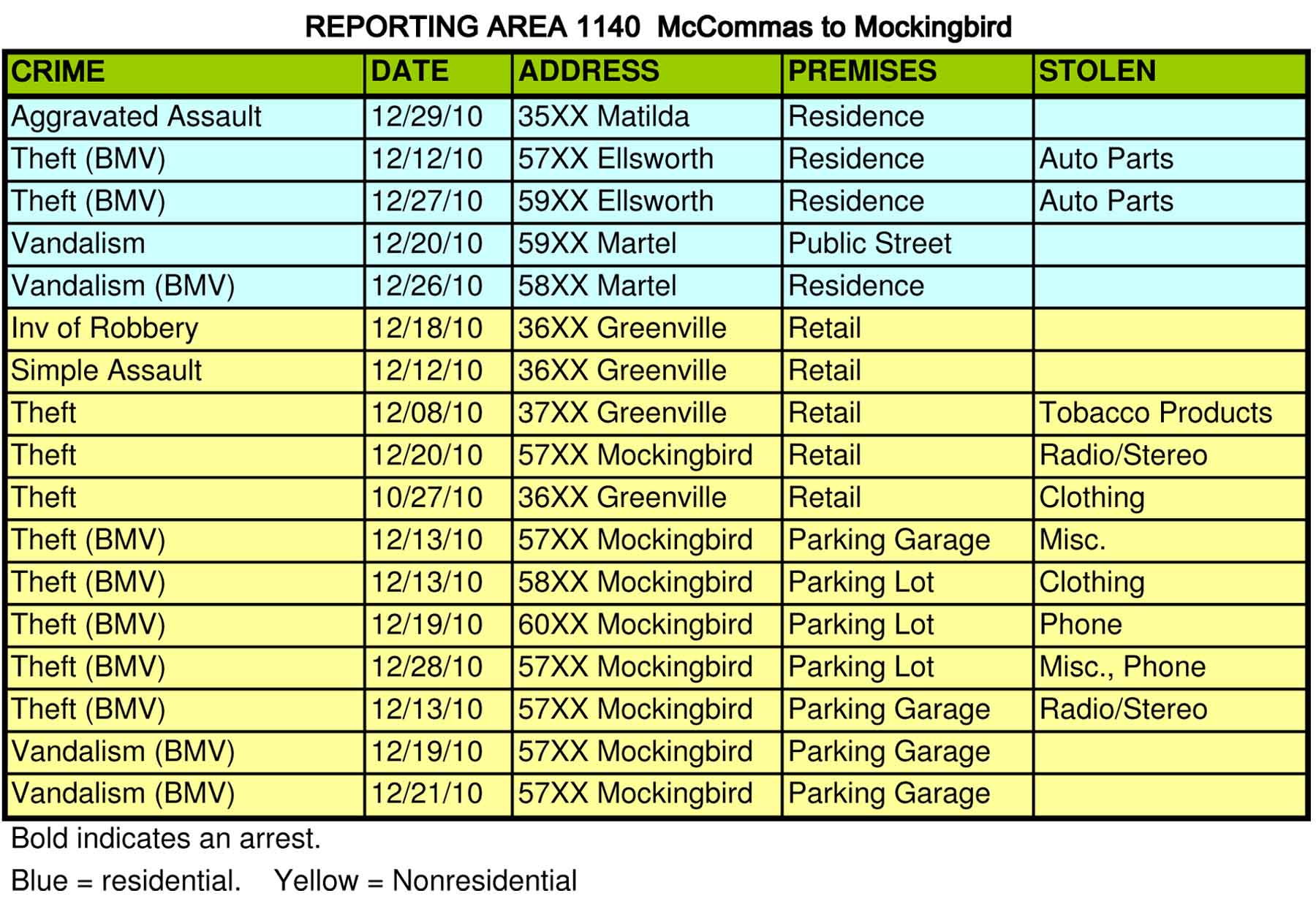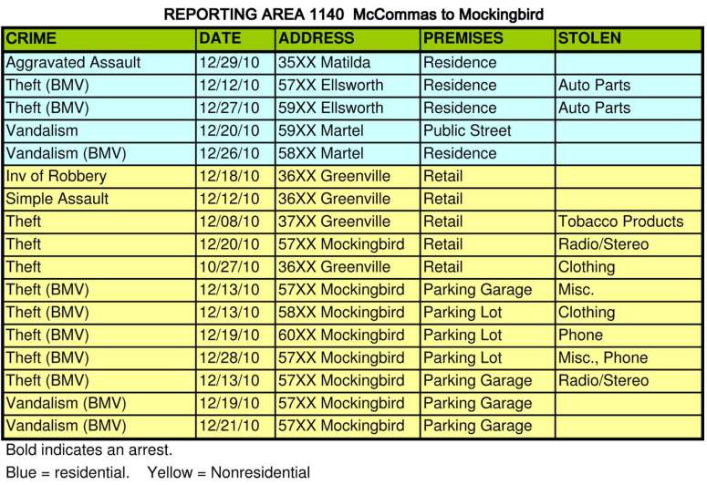 At last week’s quarterly Crime Summit, DPD released their numbers for the entire Central Division. Our area, which is Sector 140, covers the entire Lower Greenville area, not just the LGNA area. They report that violent crime was down 31% for the area: Robberies were down 40% and Aggravated Assaults down 14%. Property Crime were down 18%, but most of those gains were in shoplifting and business burglaries. Home burglaries were down 6% and car break-ins up just slightly by 1%.