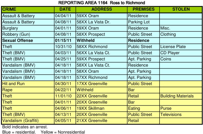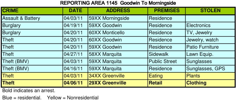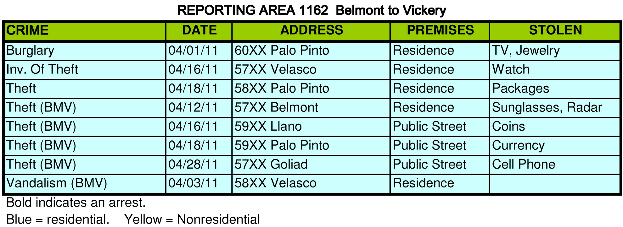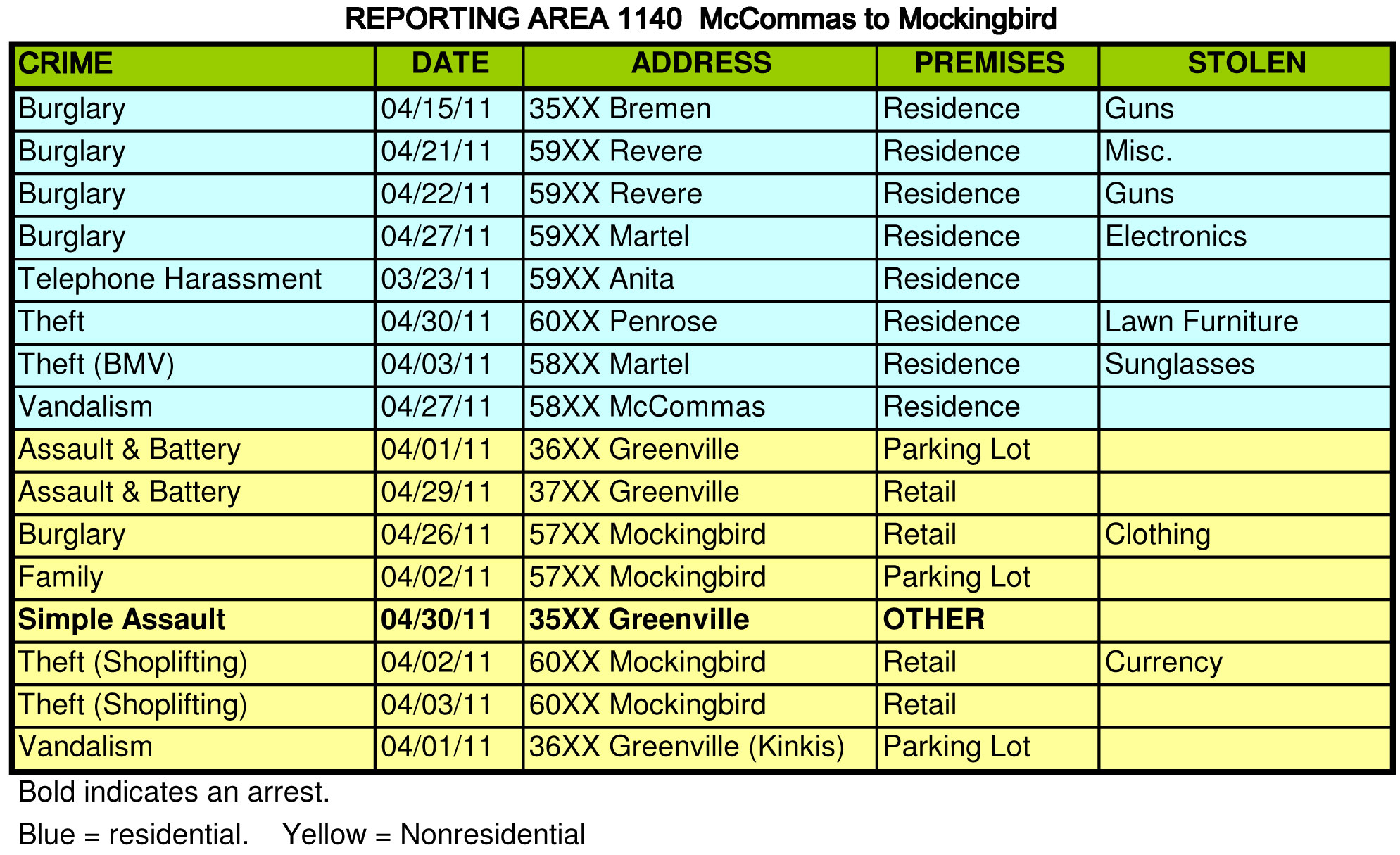 Last month I told you about a series of burglaries with a similar MO: breaking in through a rear window, often a bathroom window and stealing jewelry or electronics but leaving other seemingly more valuable things behind. Although these incidents have occurred in different parts of the neighborhood, there was a short string of them in the 5800/5900 blocks of Martel and Revere which we are fairly sure are connected. I what I hope is good news, police have arrested a suspect in an incident on Mercedes which matches this MO exactly. They’ve asked me not to release specifics since they are still interviewing victims and witnesses on other cases and releasing it might compromise the prosecution. However, I can tell you he is a mid-twenties career criminal who has been arrested 39 times already and served time for burglary. (Do the math on that…) This is a very average white guy who blends in well and looks much like any other resident in the neighborhood. He is a thin guy with blue eyes and dirty blond hair but sometimes has it shaved off. I’ll follow this arrest to see what happens. If you have been the victim of a burglary recently, you may be contacted by DPD for more information. Please return the call if so.