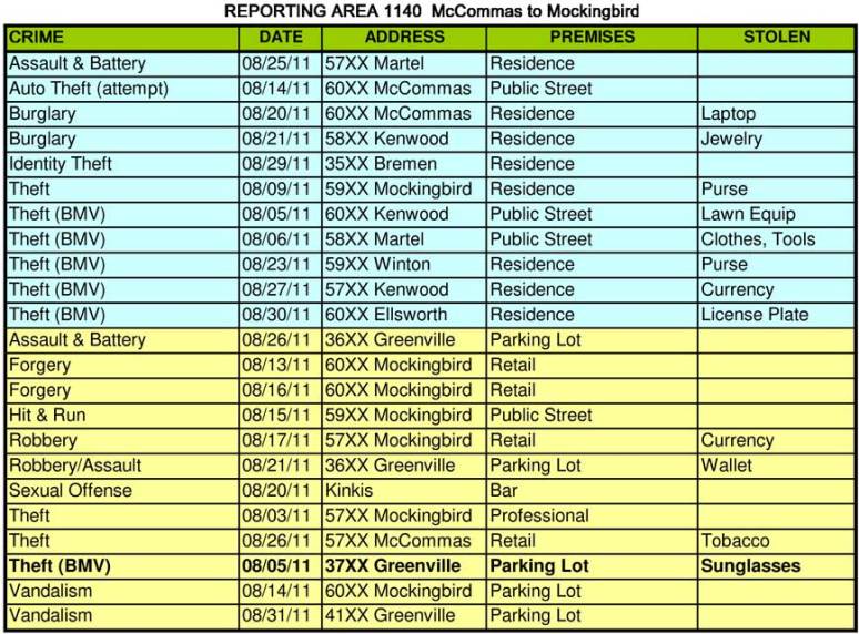 Two scary incidents this month. In one incident on Kenwood, a resident was sleeping on the couch with the front door unlocked. A white male, 50ish entered the home. He quickly left when the resident woke. Apparently he’d been handing out “curb painting” flyers. Our ENP officer is following up on this one. But as we’ve warned, be VERY leery of anyone selling this service. Lesson here, keep doors locked all the time, even when you are home. In a seperate incident, residents on McCommas had their home broken into in the middle of the night while they were upstairs asleep. Two males pried open the back door and came through the house carrying flashlights. When confronted, they fled out the rear of the home with a new laptop still in the box from the store. Use of flashlights and crowbars implies a slightly more sophisticated criminal than the usual, more sloppy kick-ins we get. The victim beleives that they had peered through the windows before breaking in based on some trampled bushes near where the computer had been sitting. Lesson here, much like with your car, don’t leave valuables visible from a window. Pull the curtains or put them in a closet.