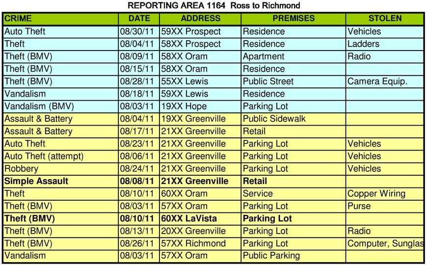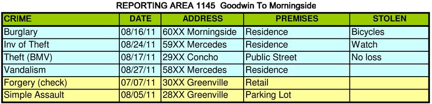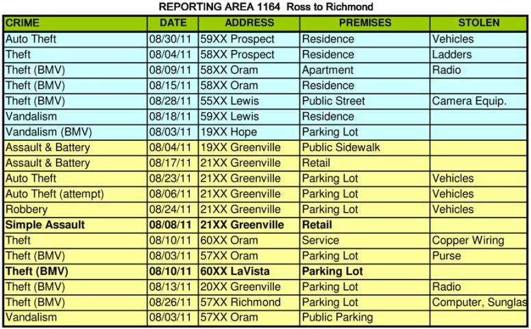 Last month I told you about a cluster of burglaries that were occurring in the 5900/6000 blocks between Belmont and Velasco. Those have continued with 4 more this month. In addition there has been a series of thefts and burglaries in the 6000 blocks of Morningside, Mercedes and McCommas. There have been 6 burglaries in the last 3 weeks in this two block area. This follows a similar string of burglaries a few weeks earlier in Wilshire Heights were 4 homes were hit in one week. Our ENP officer and our regular patrol are aware of this and are taking steps to stop it.