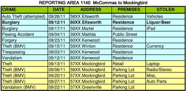From the data below, you can see there were 5 burglaries in the area between Marquita and McCommas, and Matilda and Skillman. (This area rarely sees burglaries.) These are part of a trend that is happening outside our neighborhood as well, both in Wilshire Heights and in the M-Streets to the east of us. Each time, there will be a cluster of several burglaries in one area. The thieves are breaking in through the back door and seem to be focussed on stealing Apple products such as iPads, Mac laptops and iPods. There are similar incidents happening in other parts of the neighborhood, but there have been clusters in this area that definately seem related. Initially these incidents were occurring in the early evening hours, but more recent events have occurred in the daytime. Police are watching reports daily for new incidents and deploying resources as needed to try to catch them. As a result, there were 3 arrests for theft or burglary this month, but these were not part of the trend.