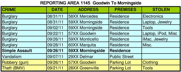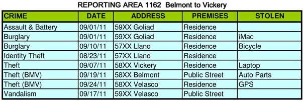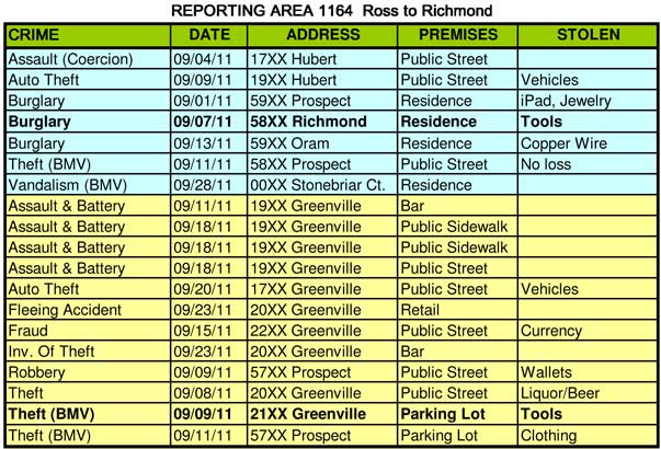 The Crime Reports for September 2011 are below. Although from the big picture, it looks like everything was about average this month, we do have a burglary issue hitting the area. I also wanted to thank all of you who came out to this year’s National Night Out earlier in the month. We estimate over 1000 neighbors came out for the event.