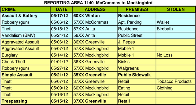 There have been several more cases of armed robberies recently in and around the LGNA area. (This fourth one was more personal, not random.) In the neighborhood, a older man was walking from his car to his apartment on the 5700-block of McCommas when he was approached by a single gunman who demanded his wallet. There were two other suspects in the vehicle. There were witnesses nearby as well. Police responded very quickly and were able to find the robbers and arrest them. They are known bad guys suspected in other incidents. Unfortunately, the victim and the witnesses were unable to identify the suspects in a lineup. But hopefully, DPD will have no trouble linking them to some other cases and getting them off the street. Just two days prior, a man was robbed on McCommas just across Greenville near the BlueFish parking lot. In another robbery, a man walked into Walgreens with a shotgun and attempted to hold-up the place. When the clerk was unable to get the safe open, he fled without incident. There was yet another armed robbery nearby at McMillan and Madera (near the Slip Inn and Pearl Cup.) Finally, there was an incident this week in the 6000 block of Belmont involving an armed robbery. The suspect vehicle pulled up into the driveway and threatened the residents with a gun and proceeded to take some items off the front porch including a wallet, phone, purse and laptop. However, this does not appear to be a random incident. From the report it seems that the robbers are aquainted with one of the residents and there was some sort of civil dispute involved. The suspects were found and arrested. Even if this is not random, we don’t want this type of behaviour going on in our neighborhood. Our ENP officer is working on a solution to this one specifically.