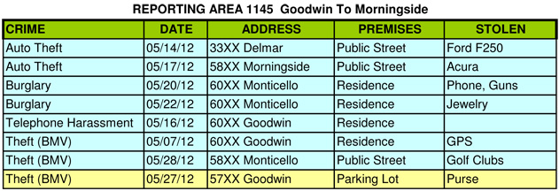 There were also 2 auto thefts this month. They occurred less than a block apart and only a few days apart. Both were parked on the street in the residential part of the neighborhood near Morningside and Delmar, not in the bar parking where these thefts usually occur. So keep ’em off the street whenever possible and please report suspicious behaviour to 911.