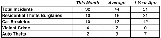 Looking at the numbers below, we had a fairly good month statistically. We were well below average on most of the catagories that I track. But behind the numbers we had a couple pretty serious incidents, read on for more. The good news is that we only had 2 burglaries (home break-ins) this month throughout the entire neighborhood. This has been a focus of ours for a while and I hope to see this stay low. The bad news is that one of these burglaries occurred while the residents were at home but entertaining in the backyard. The bad guy came in through an unlocked front door. In this case, one of the things stolen was a loaded gun. If the homeowner had come back in the house a few minutes earlier, this could have had a much worse ending. So just a reminder to keep doors locked at all times, even when you are home or have company over.