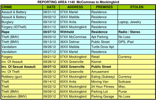 Last month I told you about two robberies that occurred on Greenville. Those are below, one on Lowest Greenville and the other near McCommas. Initially we thought the incidents were unrelated, but I’m hearing from our ENP officer that there are some similarities and it may be the same people who are also suspected in other incidents. Officer Keith also tells me that someone called in a suspicious person report that led to the capture of a suspect in the second robbery. In a third robbery, the Subway at Mockingbird and Greenville was robbed at gunpoint.