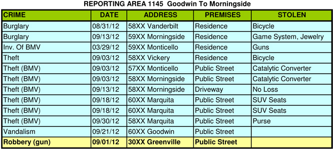 Last month, I told you about thieves that were targetting tailgates from pickup trucks. This month, they have a new wish list. There were two incidents the same night on Monticello and Morningside where a thief made off with a catalytic converter. Both vehicles were older Nissans, a 2002 and 2004. Two weeks later there were two incidents on the same night on Marquita where SUV third row seats were stolen. Both were 2011 model SUVs, a GMC and a Chevrolet. In all four cases, the target vehicle was left parked in the street.