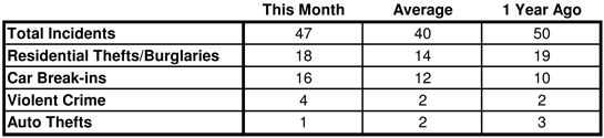 Thanks to all those who came out to National Night Out again this year. We had a great turn-out and and lots of great exhibitors. The crime reports for September are below. I’ve already emailed about the rape that occurred at the Turtle Dove, that incident is below. As I’d mentioned, the police have a suspect in custody on that incident. The overall numbers were fairly normal this month though we had a handful more car-break-ins, four of which are connected (see below). One thing I would like to point out… Of 9 car break-ins that occurred this month, 8 of them were cars parked in the street and one was parked in a driveway. Four had been left unlocked.