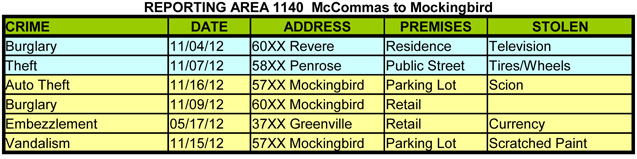 The crime reports for November are below. Another good month on the overall numbers with only two residential burglaries. Two of the robberies I mentioned last time are shown below in this month’s report. No robberies have been reported thus far in December. Last month, I had given you some safety tips for the holidays, one thing I forgot to mention is to avoid having packages shipped to your home where they might be left on the porch. One option is to have them delivered to your office. Another option is to ask the sender to require a signature. But you can also have your packages sent to the UPS Store at Mockingbird and Greenville. They will receive and hold your packages until it is convenient for you to pick them up during normal business hours. They normally charge for this, but if you mention that you heard about it from the LGNA crime watch, they’ll waive the fee.