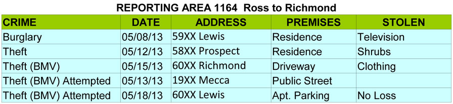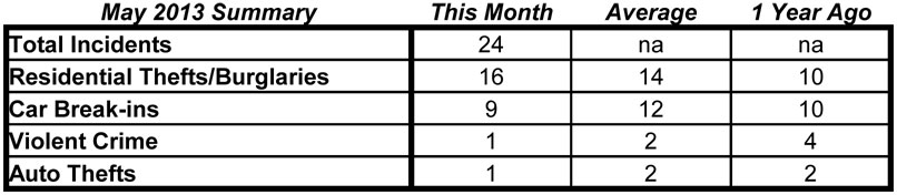 Our crime reports for May are below. This was a fairly quiet month without a great deal of activity. Car break-ins were down slightly and there were only 3 home break-ins.