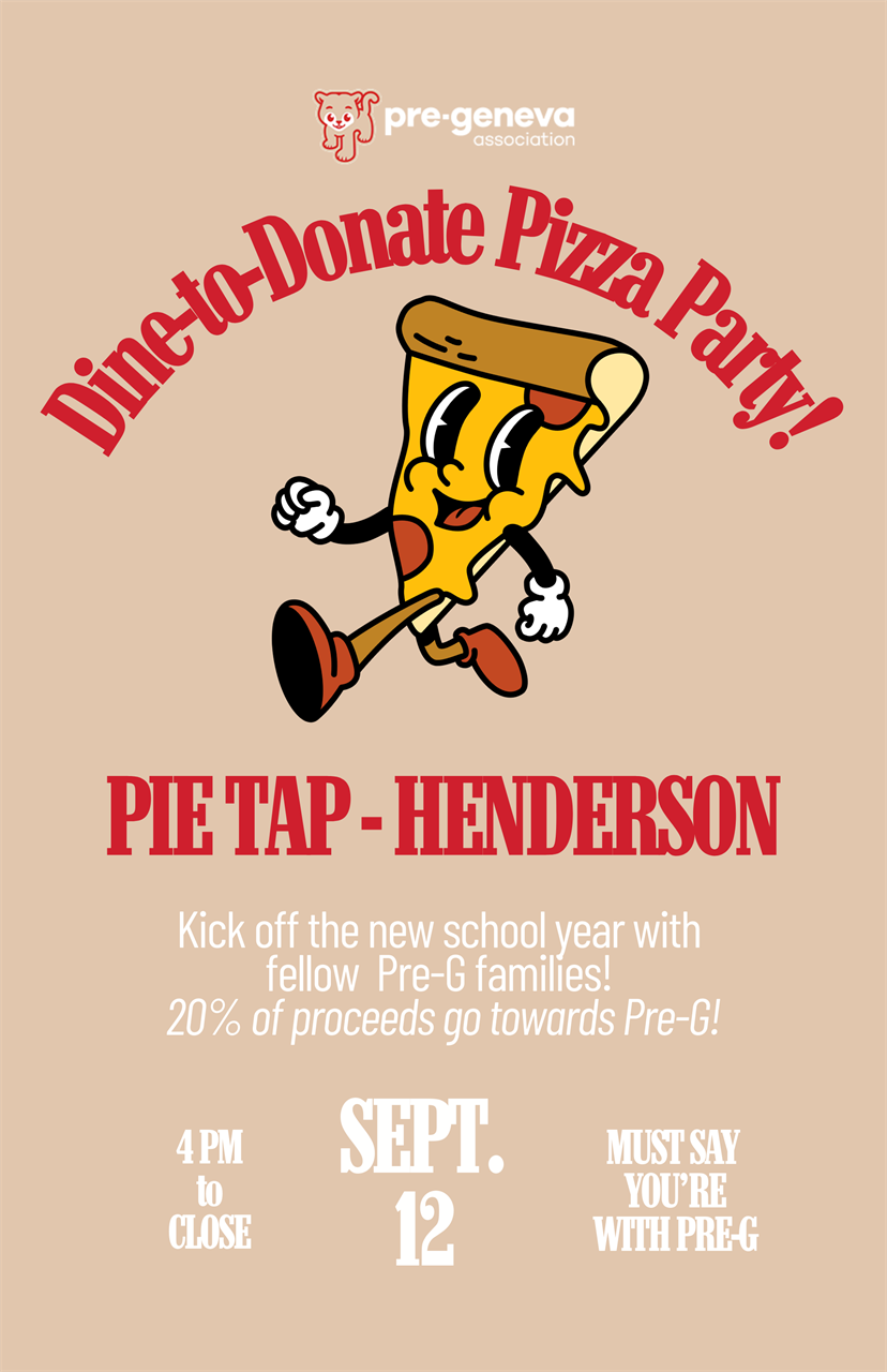 Pie Tap on Henderson is hosting a “Dine-to-Donate” pizza party for Geneva Heights’ Pre-Geneva Association. Mention that you’re dining for Pre-G on 12 Sep 2024 and Pie Tap will donate 20% of their proceeds!