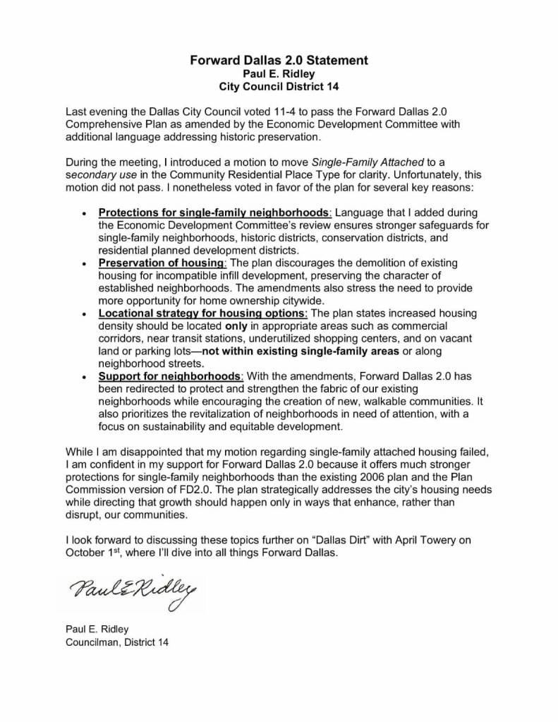 There was a lot of debate around the merits of ForwardDallas 2.0 prior to its passage. Kelly Dearmore wrote in the Dallas Observer “Contention over the plan pitted those favoring higher-density housing — meaning apartments — against homeowners in single-family residential areas who fear its effect on their neighborhoods and property values.”