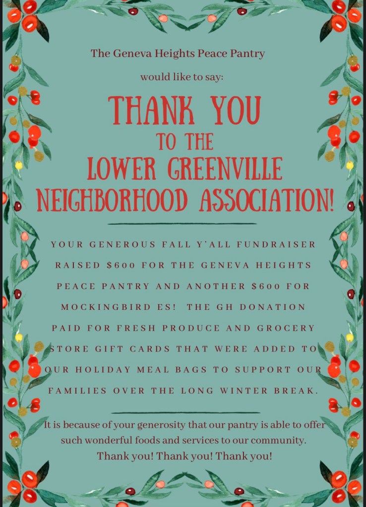 Through the generosity of donating attendees and of our sponsors, we were able to cover the cost of the event AND give the Peace Pantries at Mockingbird and Geneva Heights Elementary Schools $500 each. A big THANK YOU to our Platinum Sponsors – Courtney Conley at the BAR Real Estate Group, AwShucks, Pet Supplies Plus, and Goodwins – and to all our other sponsors!