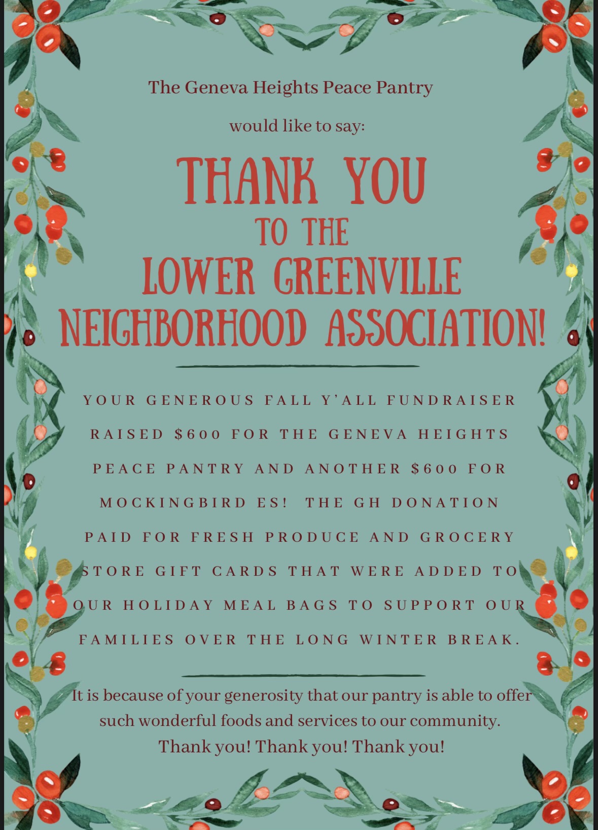 Through the generosity of donating attendees and of our sponsors, we were able to cover the cost of the event AND give the Peace Pantries at Mockingbird and Geneva Heights Elementary Schools $500 each. A big THANK YOU to our Platinum Sponsors – Courtney Conley at the BAR Real Estate Group, AwShucks, Pet Supplies Plus, and Goodwins – and to all our other sponsors!